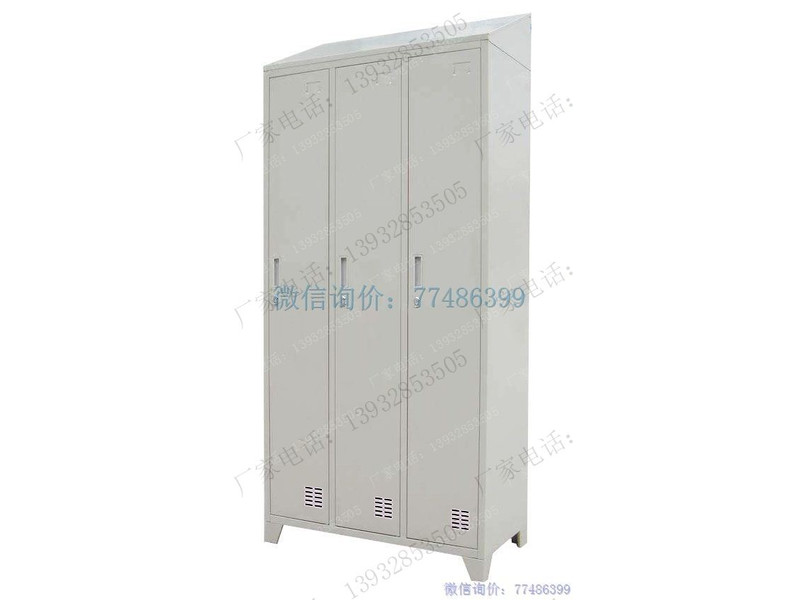 八字腿斜頂帶掛鎖的三門(mén)更衣柜,標(biāo)準(zhǔn)三門(mén)更衣柜,可掛放大衣服的通體三門(mén)更衣柜子,更衣柜門(mén)上帶扣手鎖具,通風(fēng)孔,門(mén)內(nèi)有衣桿,擱板,選配更衣小鏡子,更衣柜采用八字腿,可以防濕防潮,柜體頂部帶斜頂坡,更易清潔,適用于食品廠、制藥廠潔凈車(chē)間使用的更衣柜產(chǎn)品。
